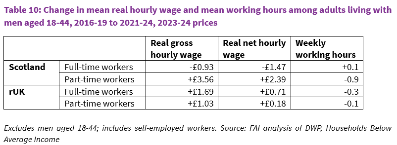 The decomposition indicates that changes in employment patterns – that is, people moving between full-time work, part-time work, and being out of work – explain only a small fraction of the overall increase in poverty. It therefore appears that the fall in earnings among adults living with young adult men reflects a fall in real wages rather than a fall in working hours or employment levels. This is supported by Table 10, which shows that, although a reduction in average working hours was observed among part-time workers in Scotland, which was larger than the reduction observed in rUK, more notable was the real reduction in average hourly wages among full-time workers, by nearly £1.50 per hour in net terms.3 This reduction was not mirrored in rUK or among part-time workers in Scotland among the adults living with young men.