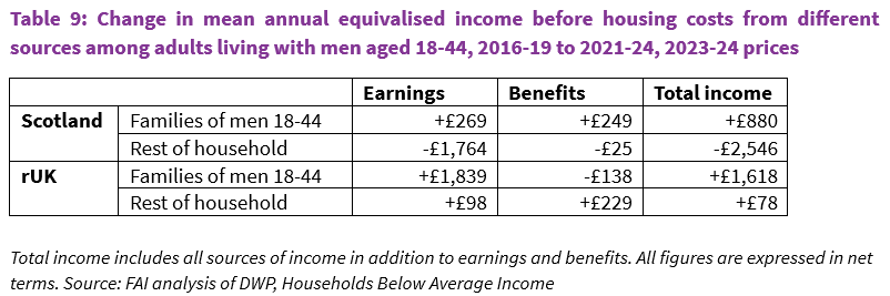 This is verified in Table 9, which distinguishes between the income received by young adult men’s own family units (including themselves and their partners) and the income received by other household members (such as parents and housemates).2 The table shows that while the incomes of their families increased in real terms in both Scotland and rUK between 2016-19 and 2021-24, on average this increase was around twice as large in rUK. Yet the difference is even starker when it comes to the rest of the household, for whom average income grew marginally in rUK while falling by around £2,500 per year in Scotland. Most of this fall reflected a real-terms drop in earnings rather than benefits.