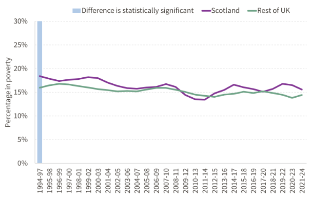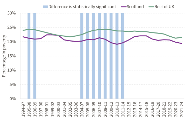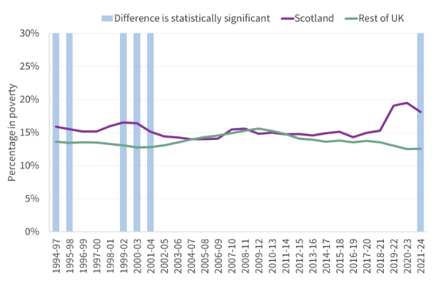 - A similar trend was observed on the BHC measure; and since the BHC poverty rate among young adult was already higher in Scotland than rUK, this has opened up a statistically significant difference in the latest period (2021-24).