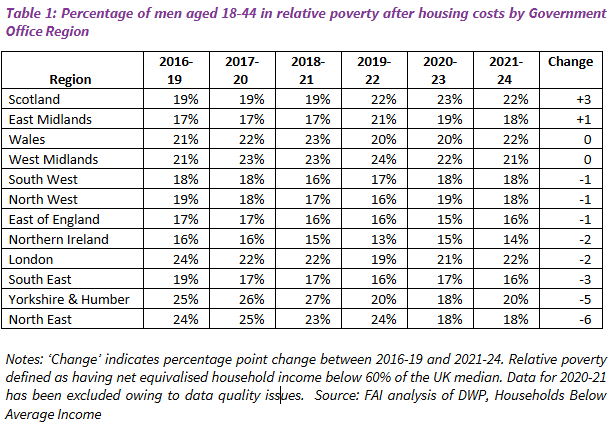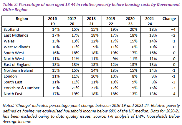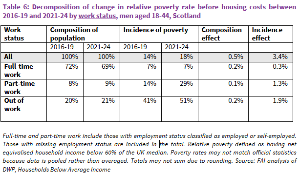 - The increase in poverty was specific to young adult men in Scotland: it was not observed to the same extent among women in the same age bracket or among young adult men in any other UK region.