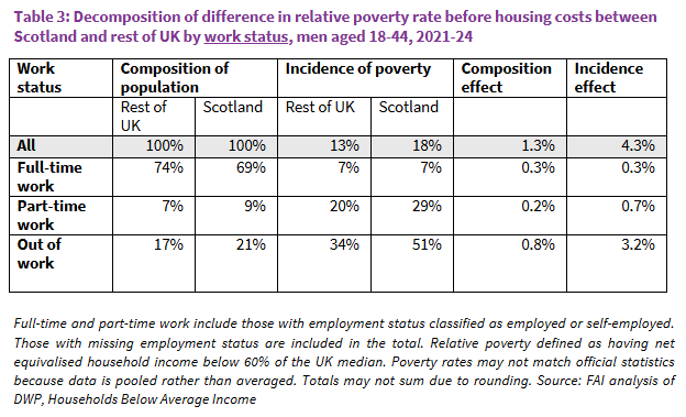 Table 3 decomposes the difference in poverty rates among men aged 18-44 in 2021-24 by work status. There are some differences in composition, with Scotland containing a lower proportion of full-time workers and higher proportions in the other categories. However, the main differences lie in the incidence of poverty – particularly among those who are out of work, half of whom are in poverty in Scotland as compared to one-third in rUK. Accordingly, the incidence effect among this group explains most of the overall difference in poverty rates.