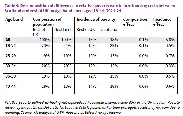 - The difference in the BHC poverty rates between Scotland and rUK among young adult men in 2021-24 primarily reflects a higher risk of living in poverty in Scotland among men aged 18-24, those out of work, and those who are single without children.