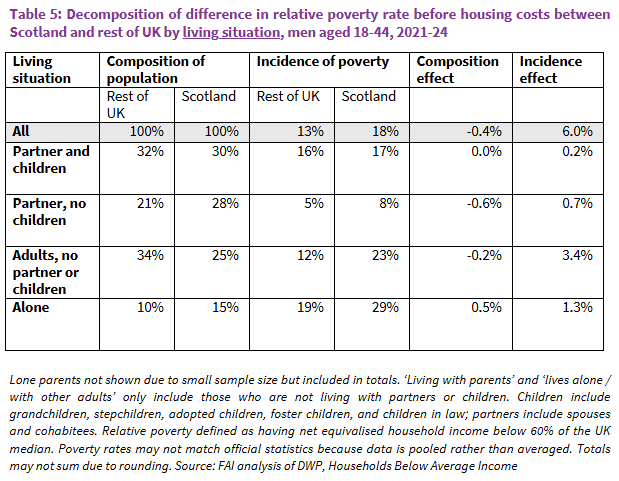 - On these dimensions, differences between Scotland and rUK in the composition of young adult men do not play a large role in explaining the difference in poverty rates, which is driven instead by a higher incidence of poverty among young adult men with these characteristics in Scotland.
