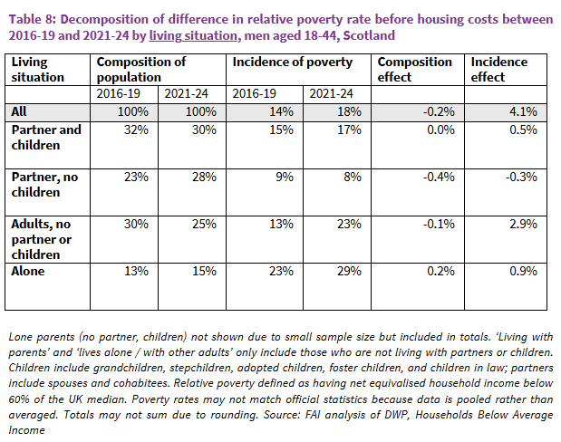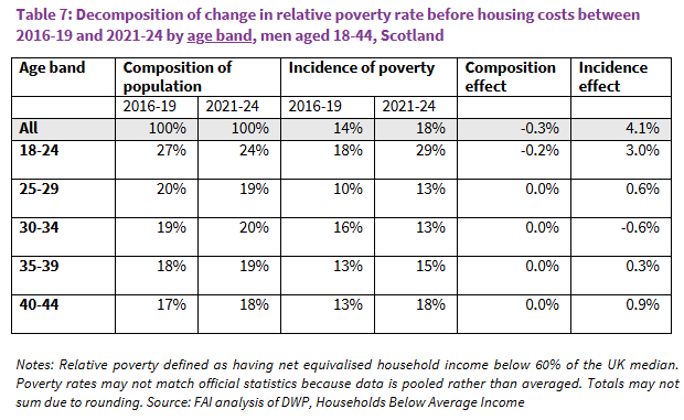 - Similar results are found when decomposing the increase in BHC poverty among young adult men within Scotland between 2016-19 and 2021-24, implying that these are new differences that have emerged since the pandemic.